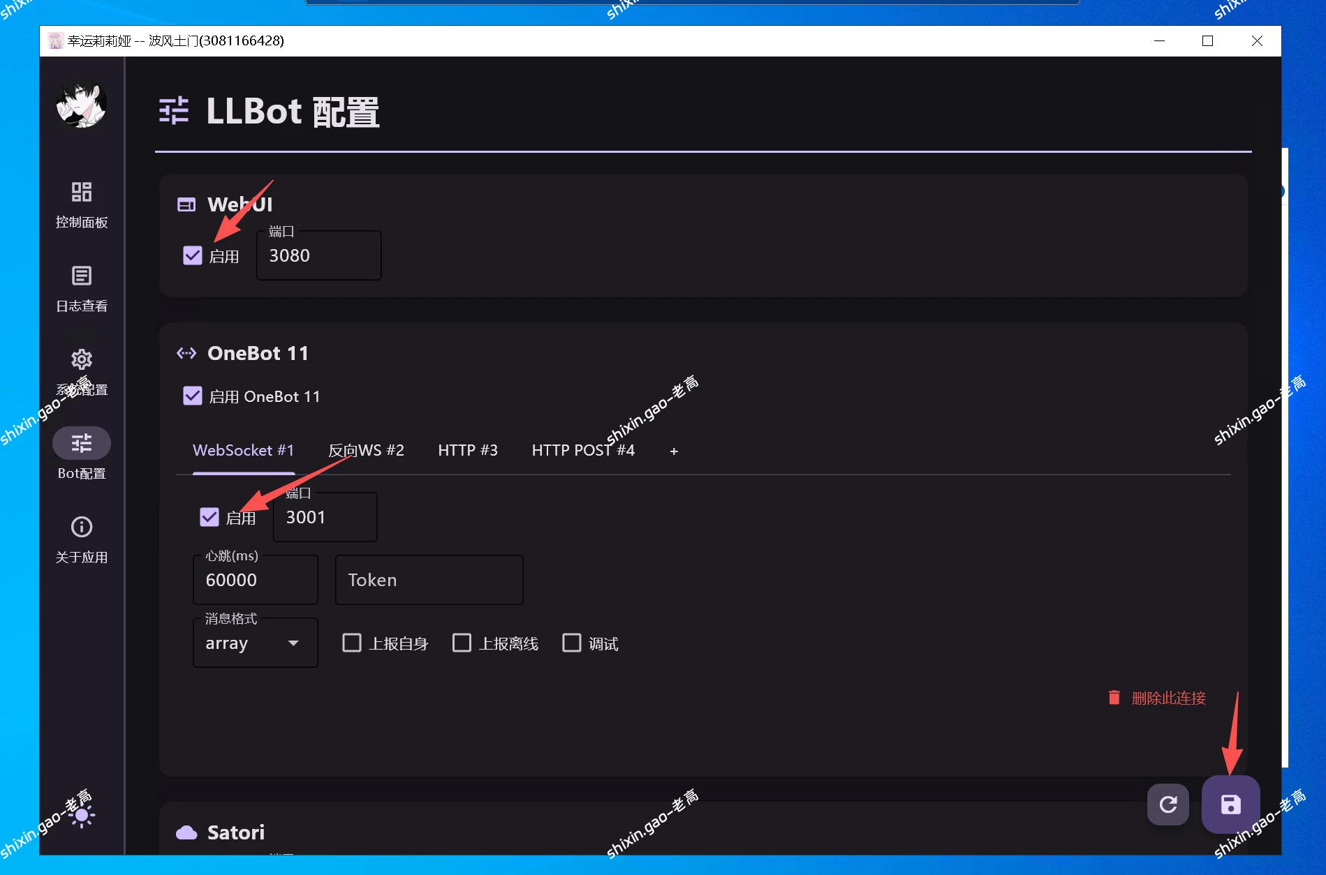 点击Bot配置 开启WebUi 开启WebSocket 随后保存